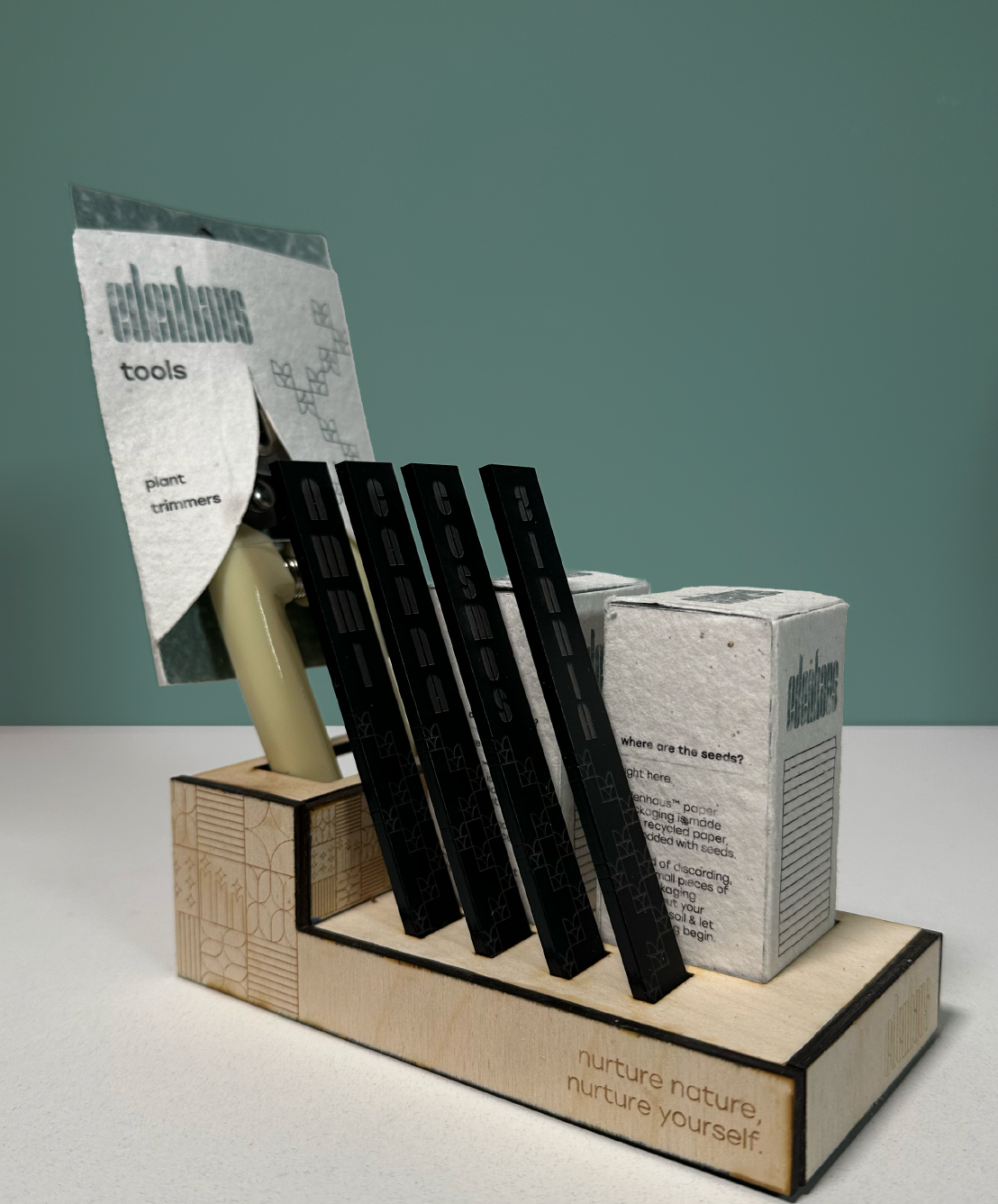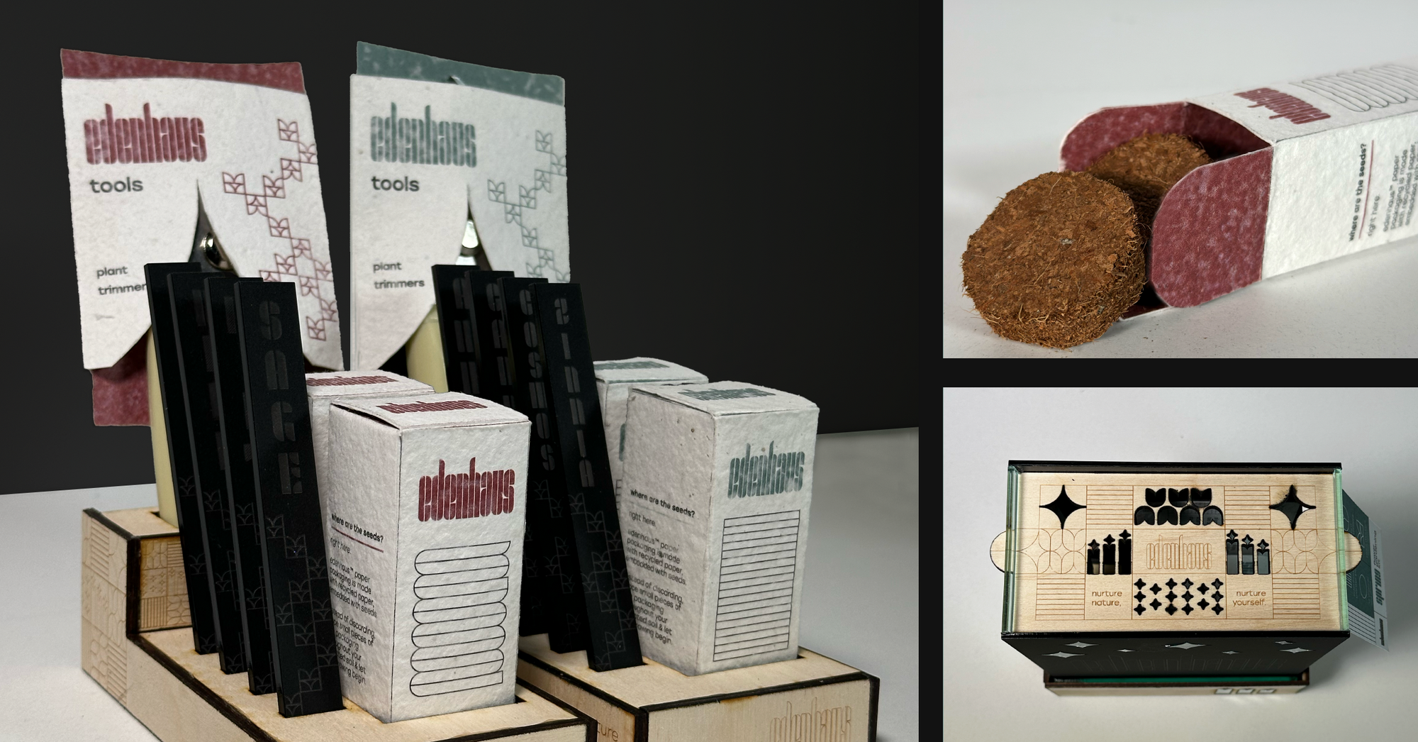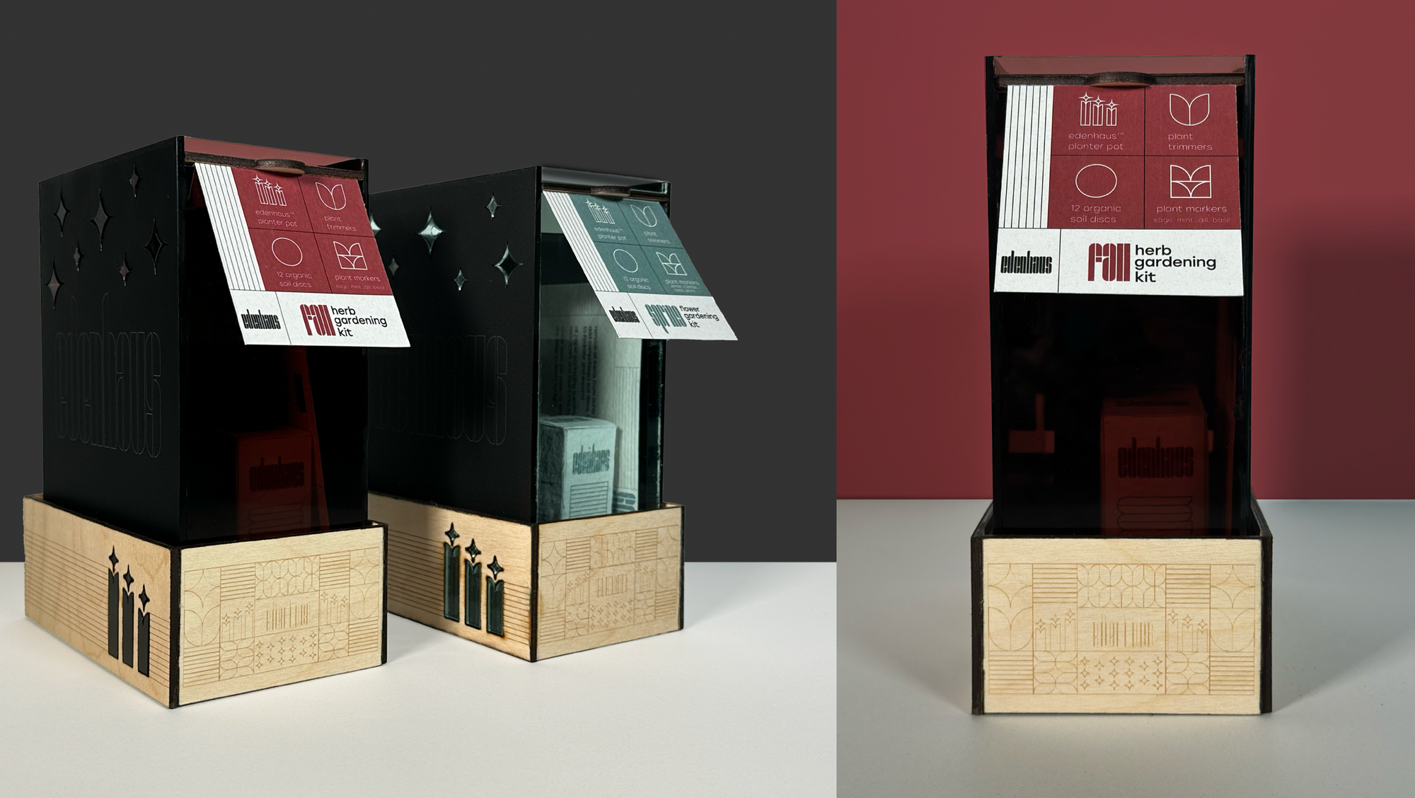 Using the brand story as a foundation, I developed a visual and structural direction inspired by nature, simplicity, and small-space living. I was responsible for designing the internal product components that allow the planter to function both hanging and standing. I was also responsible for creating the packaging design, 3D-printing prototypes, and assembling the final product to ensure everything fit and worked together as intended. In addition, I was responsible for helping develop the Edenhaus logo, contributing to a visual identity that supports the brand’s mission of bringing nature closer to people living in compact urban environments.